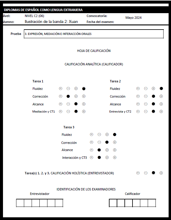 Visione o escuche la actuación de la candidata y elija la tarea (tarea 1, 2 o 3) que se describe en cada fragmento del informe de calificación, en el que se explica por qué la muestra se sitúa en la banda 2. Una vez finalizada la actividad, puede descargarse el informe de calificación completo.